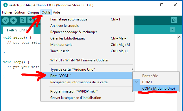 Dans le menu [Outils/Port COM] on defini le port COM sur lequel est branché la carte.