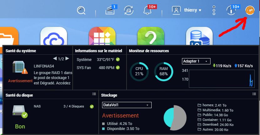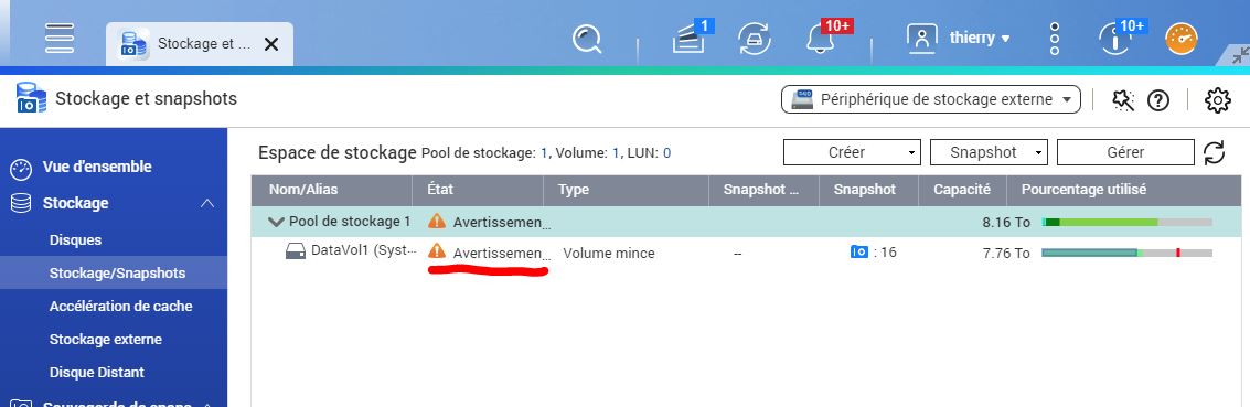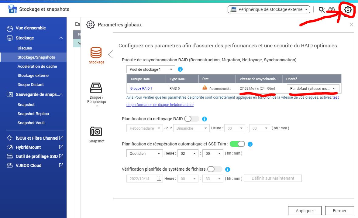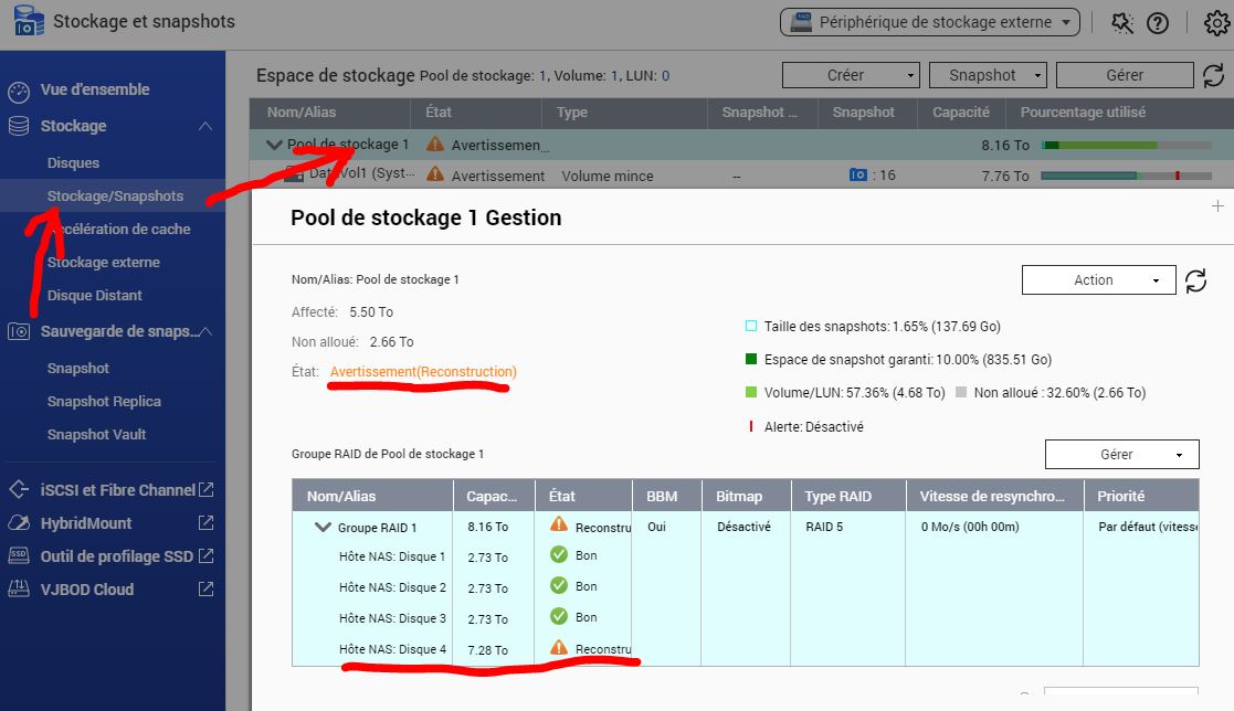 Message : [Stockage et snapshots] Début de la reconstruction du groupe RAID « 1 ». Pool de stockage : 1, priorité : Default.