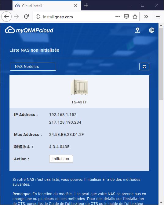 La page web detecte le NAS a configurer sur le réseau local