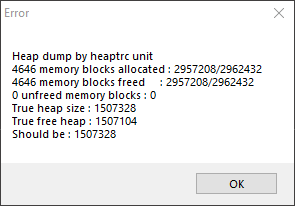 THeapStatus = record TotalAddrSpace: Cardinal; TotalUncommitted: Cardinal; TotalCommitted: Cardinal; TotalAllocated: Cardinal; TotalFree: Cardinal; FreeSmall: Cardinal; FreeBig: Cardinal; Unused: Cardinal; Overhead: Cardinal; HeapErrorCode: Cardinal; end;