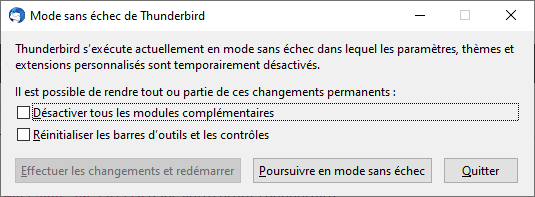 On peut démarrer Thunderbird avec la touche [Shift] enfoncée ou taper le code :