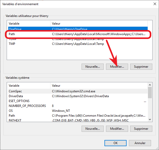 Séléctionner la ligne PATH et cliquer sur [Modifier]