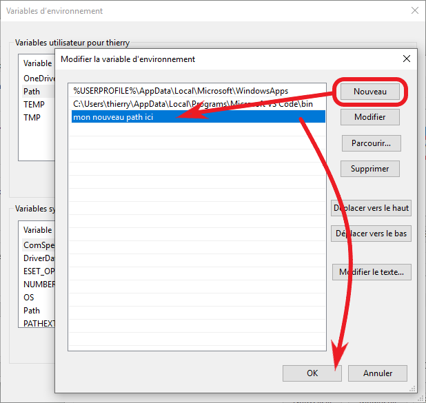 Ajouter le nouveau PATH manuellement en cliquant sur [Nouveau] ou en selectionnant un répertoire en cliquant sur [Parcourir…]
